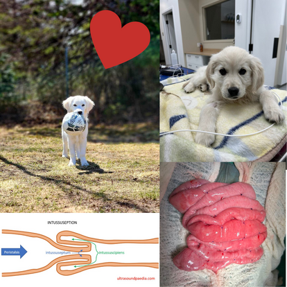 Petite capsule informative sur un cas qui se porte maintenant à merveille! Voici l’adorable Louna, une petite golden qui a eu la malchance d'avoir une intussusception, mot compliqué qui veut simplement dire l'intestin qui rentre dans lui-même et qui entraîne secondairement une obstruction intestinale. Cette condition est surtout rapportée sur les jeunes animaux, chiots et chatons, et est secondaire à un mouvement anormal des intestins qui peut être causé par différentes raisons telles que: indiscrétion alimentaire, parasitisme, gastro-entérite ou un corps étranger. Le traitement est chirurgical et consiste soit à simplement défaire l'intussusception (quand on est chanceux et que l'intestin est encore beau) ou bien de faire une entérectomie (retirer une section de l'intestin) quand ce dernier a été trop abîmé. Dans le cas de Louna, la chirurgie a bien été et on a pu simplement défaire son intussusception. Par contre, une des complications possibles de cette chirurgie est la récidive dans les jours qui suivent et ce fût malheureusement le cas pour Louna. Nous sommes donc retournés en chirurgie et cette seconde fois avons pris la décision de faire une entéroplication (attacher les intestins ensemble) afin d'éviter une autre récidive. Heureusement, Louna s'est très bien remise de sa deuxième chirurgie et peut maintenant expérimenter plein de nouvelles activités et vivre sa parfaite petite vie de chiot.